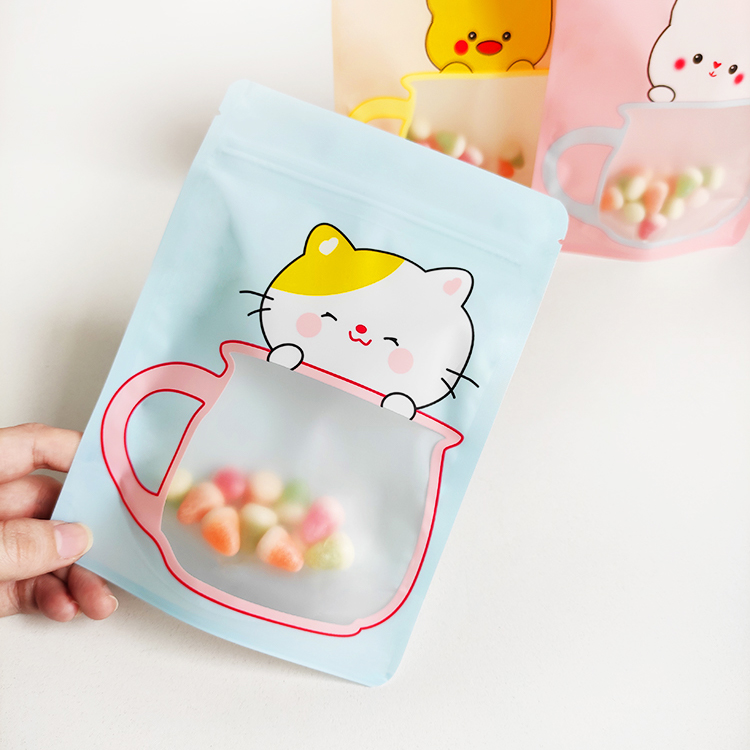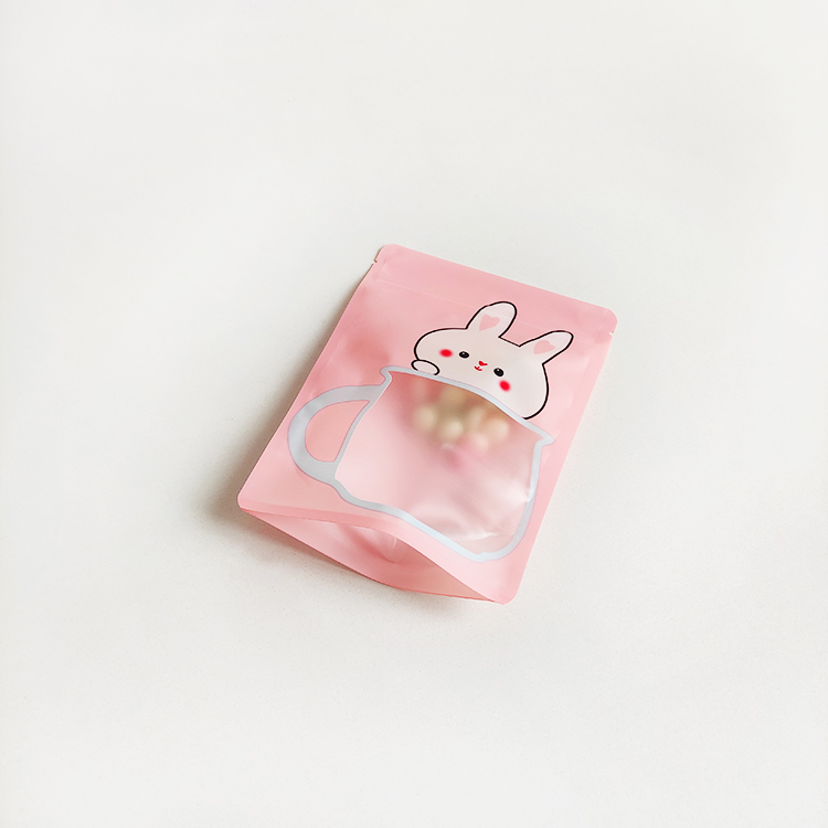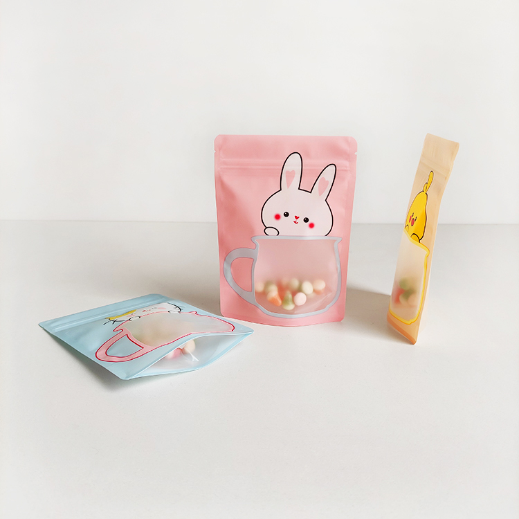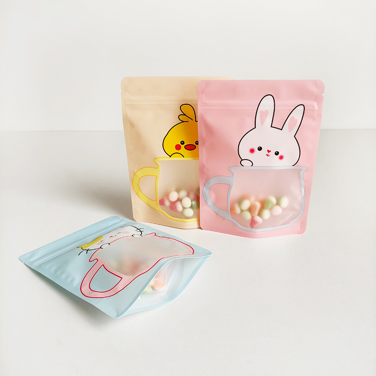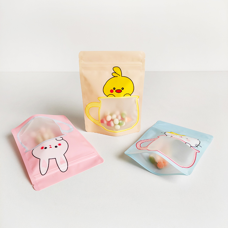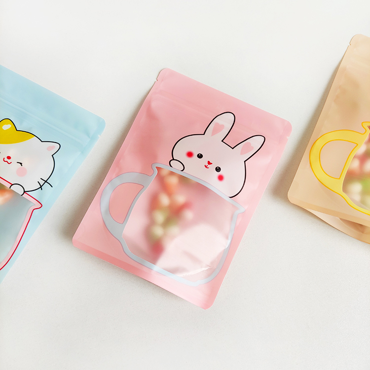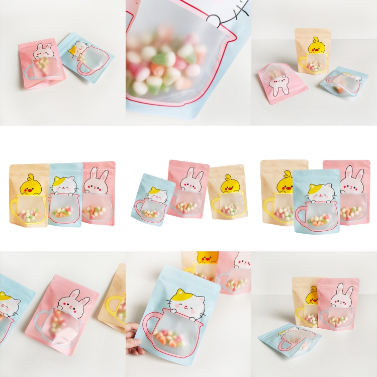 - Is Comes with Rounded Corners, available in three designs: a yellow duck, a blue cat, and a pink rabbit. It includes a matte window for viewing the contents, Resealable zipper and Tear notch.Available in a wide range of sizes, Ideal for food and non food packaging.