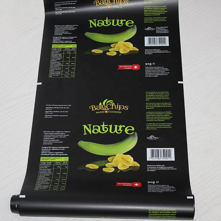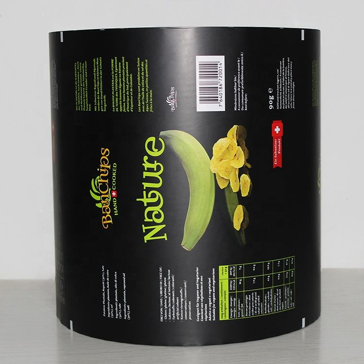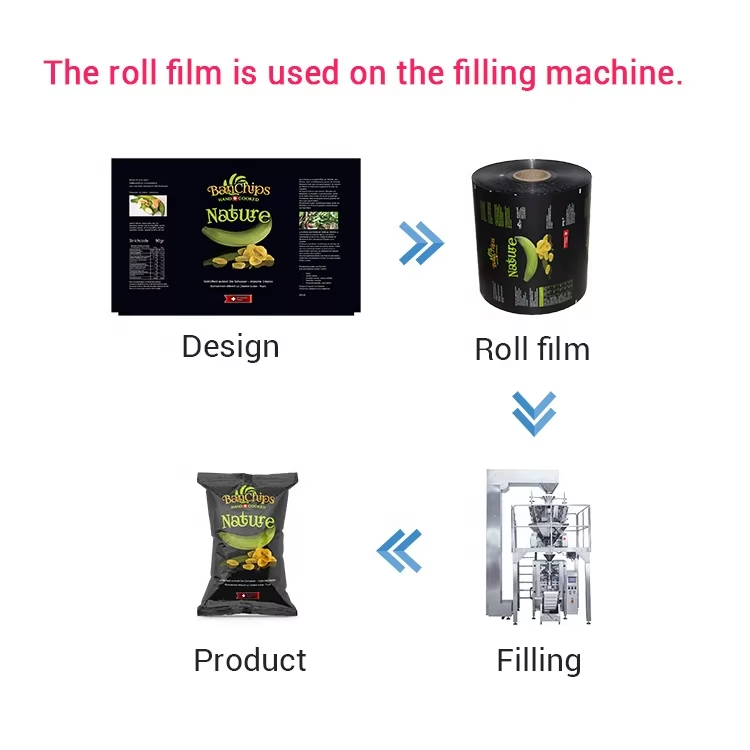 Plastic + aluminum foil 3 layers laminated flexible packaging roll stock film, suitable for automatic packing machine, special made with anti-static materials in order to avoid powder residue leading to weak sealing, suitable for potato chips,Also we can make preformed bags if your products can not use auto packing machine to filling.