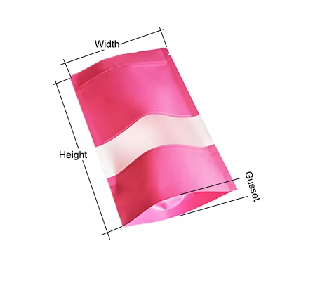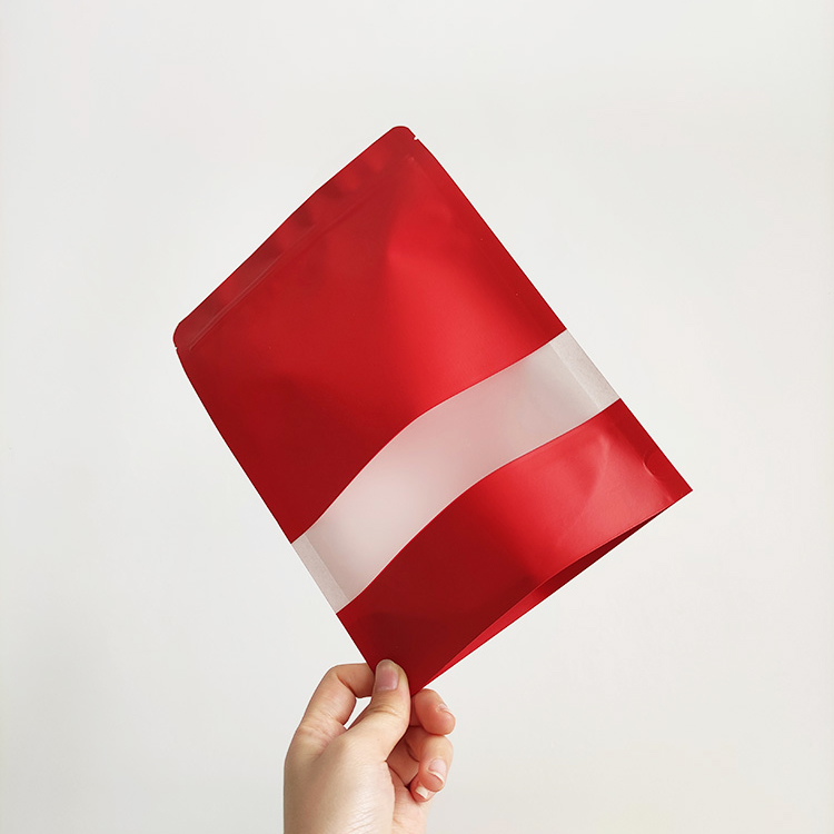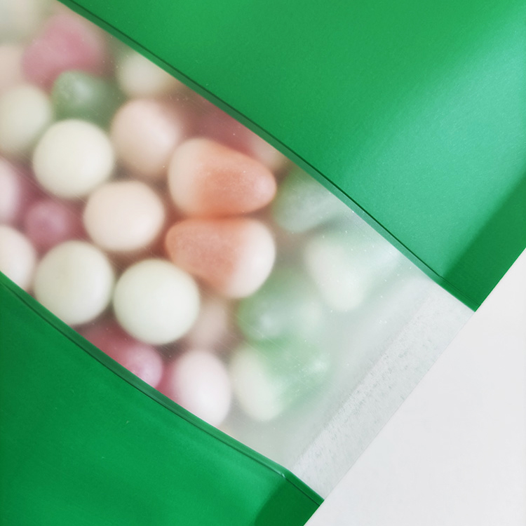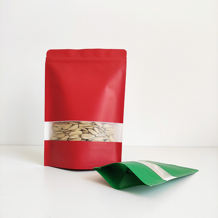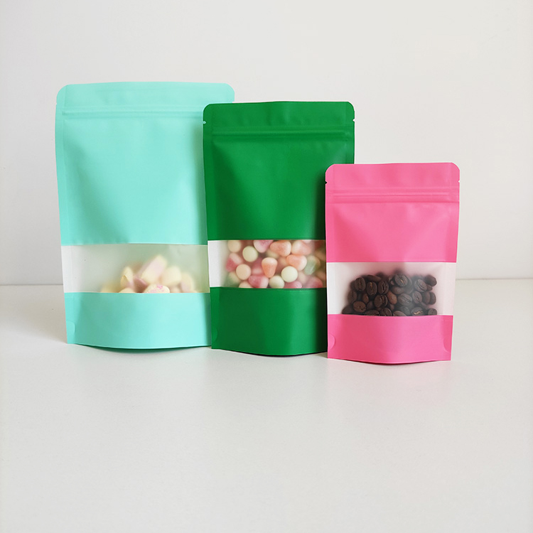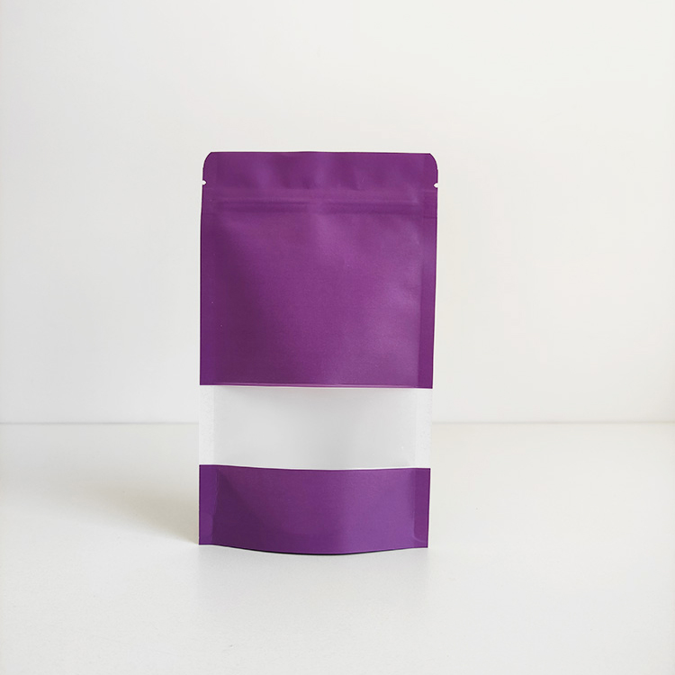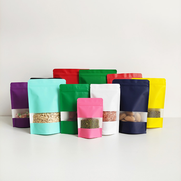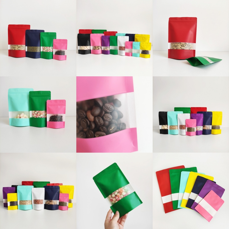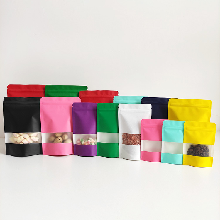 This kraft paper stand-up pouch comes in seven different colors: red, green, light blue, dark blue, yellow, purple, and pink. It features a transparent window for clear product visibility, equipped with a zipper and a tear notch. Available in a wide range of sizes, it can also be heat-sealed and labeled.