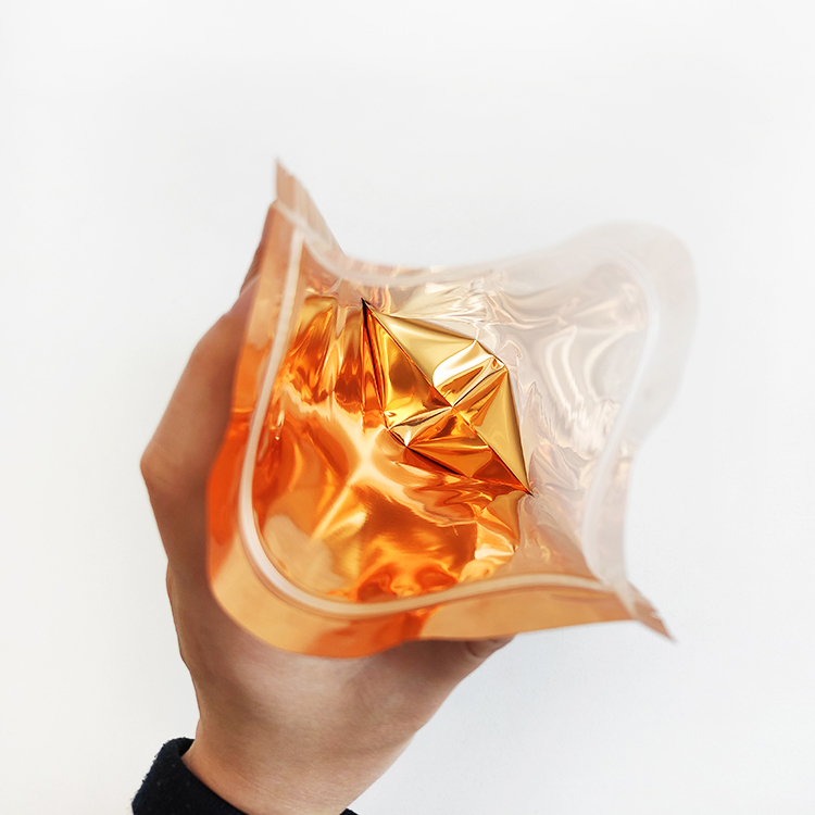 - Our Front Clear Golden Back Stand up Foil Packaging Pouches are manufactured using 3 layers(MOPP/VMPET/CPP) on both the sides which helps preserve the freshness and contributes to an extended shelf life.