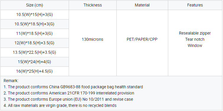 • Our Large Window Kraft Paper Stand up Pouch are manufactured using 3 layers(PET/PAPER/CPP) on both the sides which helps preserve the freshness and contributes to an extended shelf life.