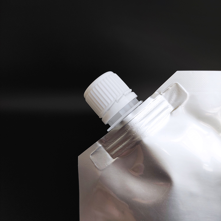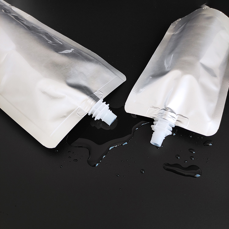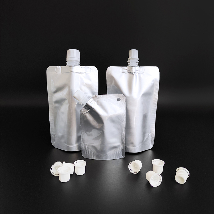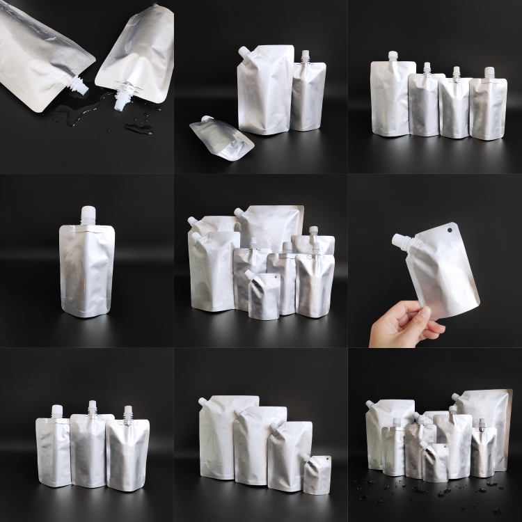 This all-silver spout pouch is made from aluminum foil and is equipped with a spout. This bag has a straight spout and a slanted spout.It comes in a variety of sizes and can be heat-sealed and labeled.
