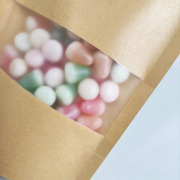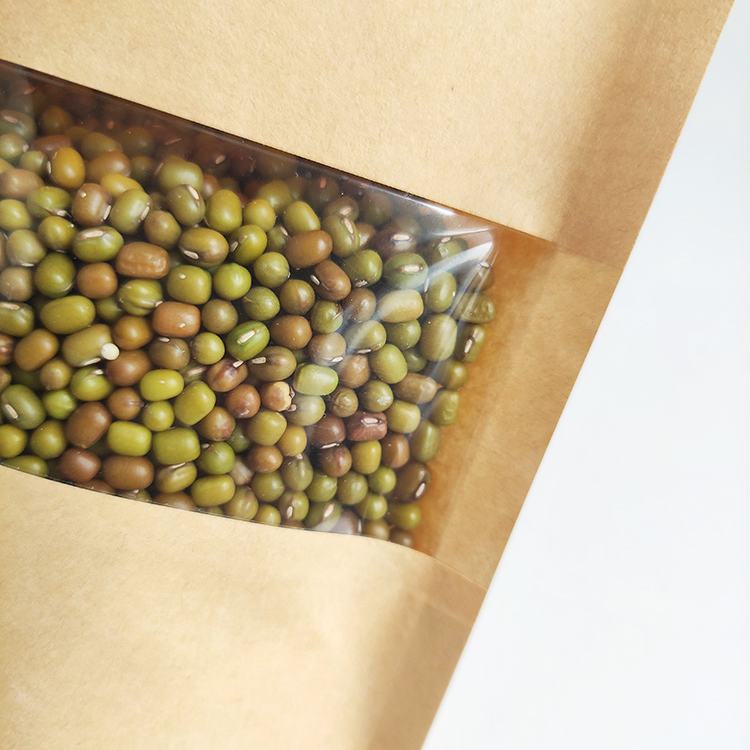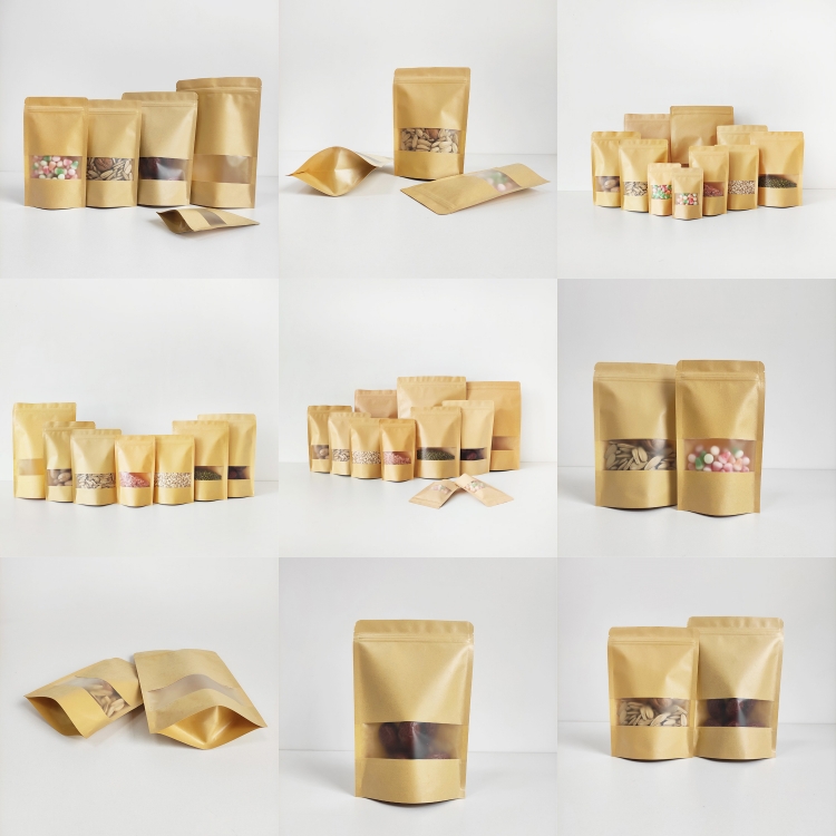This kraft paper stand-up pouch features a transparent window for viewing the contents. It is equipped with a zipper and a tear notch, comes in a variety of sizes, and can be heat-sealed and labeled.