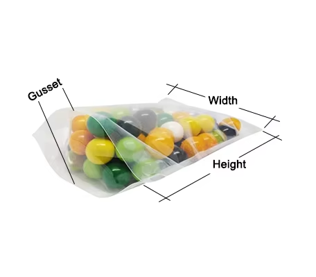 | 9(W)*14(H)+6(G) | 80 microns | PET/ LDPE | Resealable Zipper/ Tear Notch/ Heat Sealable |